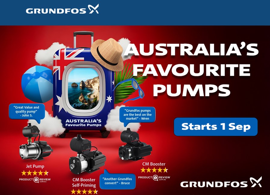 Grundfos is offering Cashbacks whenever you purchase one of Australia's Favourite Pumps, starting September 1 until November 30. You will also go into the draw to win a $3,000 Travel Voucher, so you can take off to one of Australia's favourite holiday spots, like Bali.